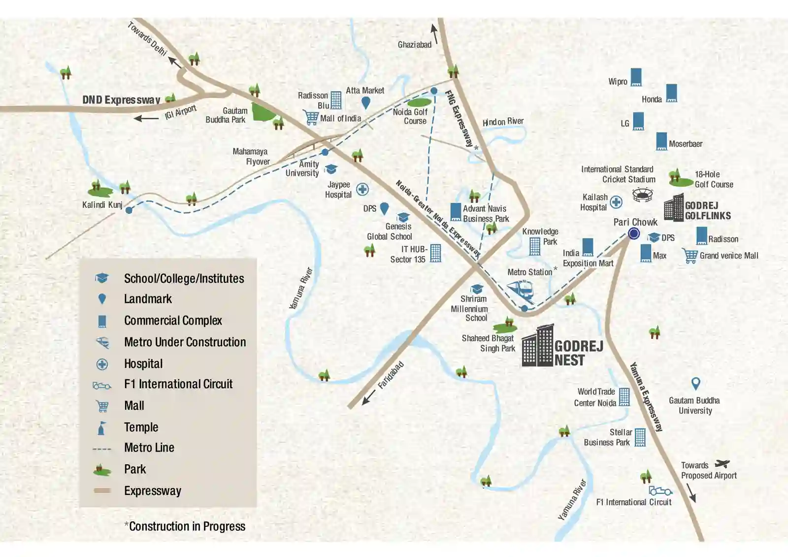 The project allows you to enjoy your health and wellness with a medical helpline, a doctor on call, an ambulance service, and a pharmacy all inside the commercial plaza. For leisure and work, the development features a café, e-library, and party lounge. Safety remains a top priority with a 5-tier security with city-level, neighborhood, perimeter, project-level, and unit-level security. Godrej Nest Noida is also connected to the proposed Jewar International Airport, anticipated metro stations, and seamless signal-free roads to Delhi, Connaught Place, Gurgaon, IGI Airport, and the New Delhi Railway Station via the Noida-Greater Noida Expressway.